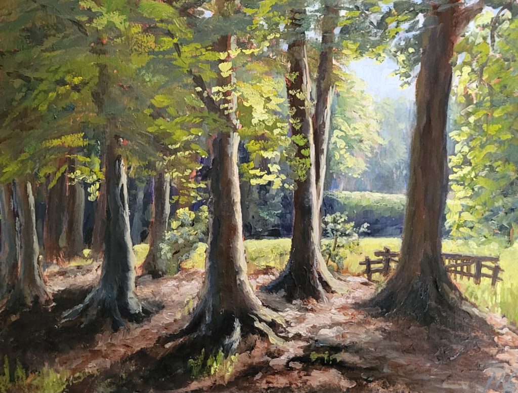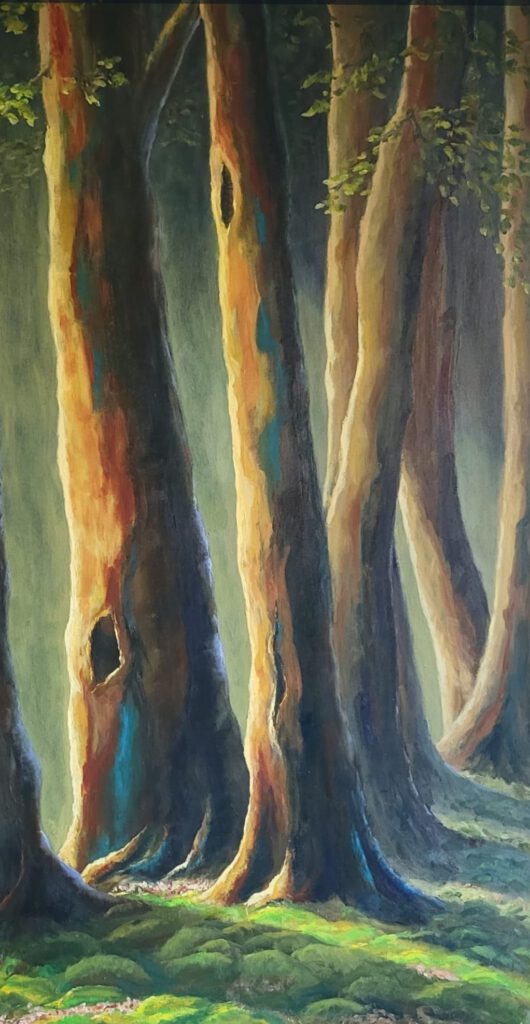“Beukenbomen landgoed Vennebroek in september”, olieverf op doek,