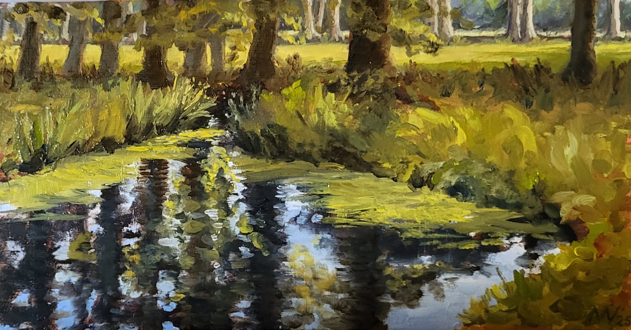 “Drentsche Aa bij Schipborg in juni”, olieverf op paneel, 40×30, 2024