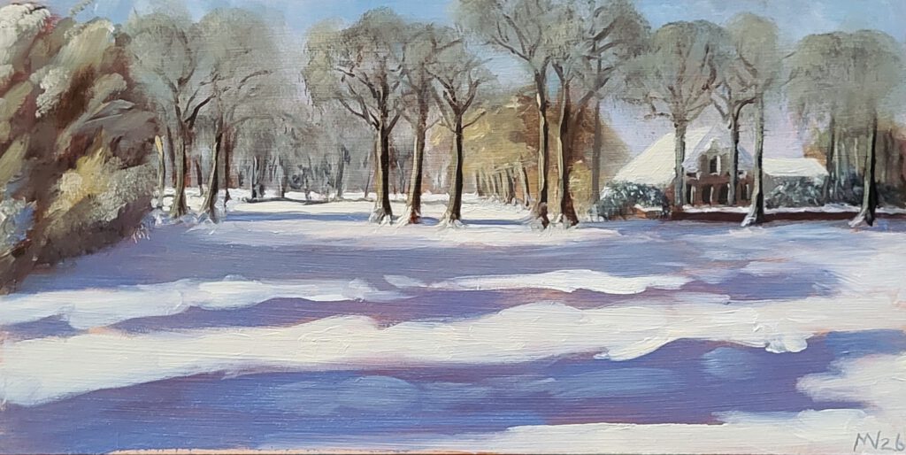 “Sneeuw in Eelde”, olieverf op paneel, 30 x 15, 2026