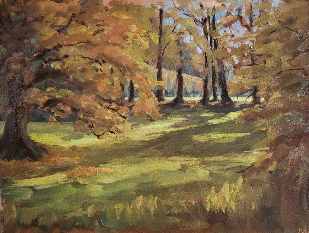 “Vrijerslaantje in de herfst”, olieverf op paneel, 40 x 30, 2025